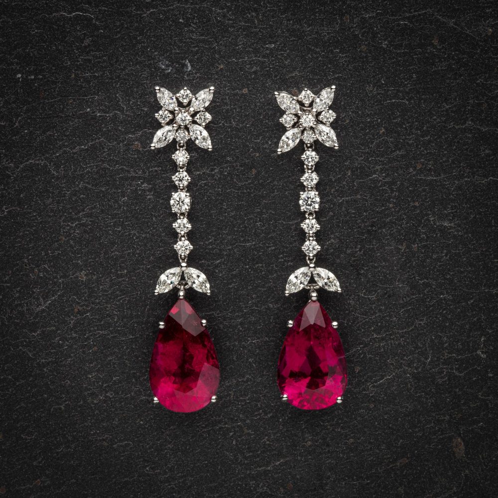 Diese eleganten Platin Ohrringe haben wir bewusst für die etwas glamouröseren Abende entworfen. Die insgesamt 16,33ct Rubellit Tropfen (Rote Turmaline) hängen an 2,61ct Diamanten in Brillant- und Navette Form.